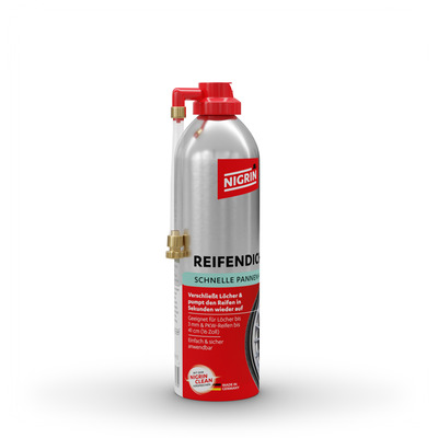 NIGRIN Reifen-Dicht ist die schnelle, unkomplizierte Soforthilfe bei Reifenpannen – ganz ohne Werkzeug und ohne Radwechsel. Die leistungsstarke Formel verschließt Löcher bis 3 mm Durchmesser in Sekundenschnelle und pumpt gleichzeitig den Reifen wieder auf.