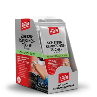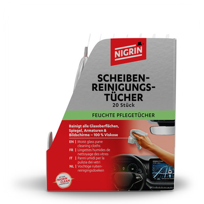 Die NIGRIN Scheibenreinigungs-Tücher sind die praktische Lösung für die schnelle und effektive Reinigung von Autoscheiben – innen wie außen. Die feuchten Tücher entfernen mühelos Staub, Nikotinrückstände, Fingerabdrücke und andere Verschmutzungen und sorgen so für klare Sicht und ein angenehmes Raumgefühl im Fahrzeug.